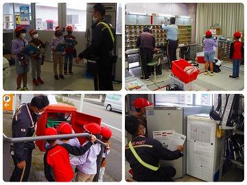 どの事業所の方も、子ども達の質問にとても丁寧に答えてくださいました。また、普段見られない郵便ポストの中を見せていただいたり、コーヒー豆の焙煎機について説明していただいたりして、子ども達は一生懸命メモを取っていました。
