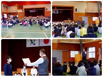 11月18日(木)、野尻町内にお住まいの白坂伊佐男様が来校され、1・2・6年生が代表で贈呈式に参加しました。