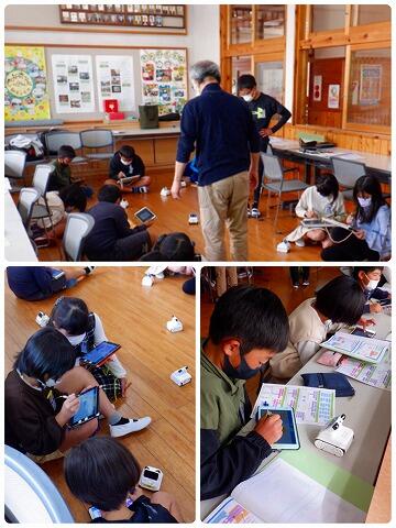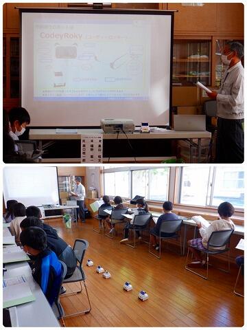 IT教室は、プログラミング学習をサポートするロボット「コーディーロッキー」を使用して行いました。このロボットやプログラミングについて説明いただいた後、実際にコーディーロッキーを動かすためのプログラミングを作成したり、話をさせるプログラミングを作成したりしました。中には、コーディーロッキーが延々と同じ話を繰り返して、止まらなくなった児童もいて、「一行改行を入れると良いよ。」と教えていただいていました。