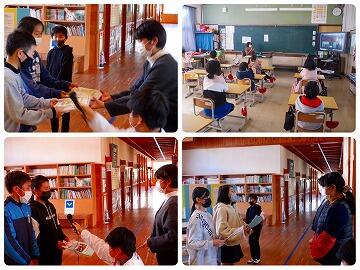 その後、児童が学級毎に、野尻学校給食センターのみなさんや業者のみなさんに感謝の気持ちを込めてお礼の品を作成したので、日髙先生に受け取っていただき、その様子をオンラインで各学級に動画配信しました。