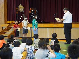 7月4日(月)、7月の全校集会がありました。校長からは「いのちの教育週間(7/1~7)」についての話がありました。「1つしかない命を自分で大切にしよう!」と、台風接近に合わせて事例を交えながら話しました。その後、生徒指導の先生からは今月の生活目標「夏を元気で安全にすごそう」について話がありました。登下校や廊下歩行について注意を呼びかけられました。「は・さ・み」の合い言葉「はしらない・さわがない・みぎがわをあるく」の確認がありました。最後に、作品展で入賞した3名の子どもに賞状がわたされました。表彰後、校長は「野尻小は作品展での表彰だけでなく、スポーツ少年団も優秀な成績をのこしている。これはすばらしいし、ほこらしいことである。でも、何より大切にしてほしいことは1時間1時間の授業である。学校での勉強をしっかりがんばってほしい。その積み重ねが大きな成果につながる」と話しました。