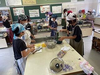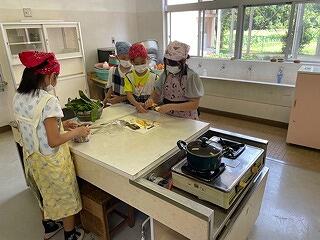 7月11日(月)、5年生は家庭科の調理実習がありました。「ゆでいも」と「青菜のおひたし」をつくっていました。ゆでいもはじゃがいもの皮をピーラーできれいにむき、ねこの手をつくって切り、芽もえぐり取ることができました。ほうれんそうをゆがくときは根元からにし、ゆがいた後は水で冷やすことなど、しっかりできていました。みんなで協力して楽しく活動できていました。