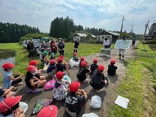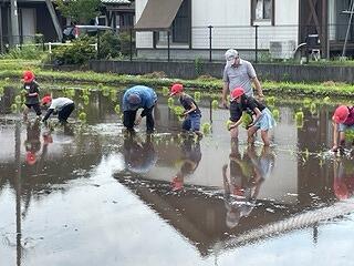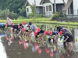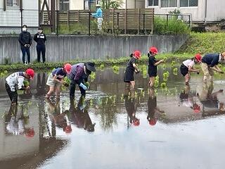 6月20日(火)に、3年生は田植えがありました。営農組合、JAこばやし、たくさんの地域の皆様の協力のもとに活動が行われました。野尻保育園や野尻幼稚園の皆さんも参加しました。営農組合長から稲を育てるために必要なこと等についてのお話があり、西諸県農林振興局(みどりネットワーク)の方からは、田んぼの役割について説明をしていただきました。開会行事がおわり、子ども達は田んぼに入りました。ぬるっとした感触に、「生ぬる~い!」「気持ちい~!」「すべる~!」など、いろいろな声があがりました。途中、つるっと尻もちをついた子どもも、、、!自分から飛び込んだ子どもも、、、!田植えでは、田植え綱のポイントに合わせて、数株ずつ苗を植えていきました。はじめは足元が悪く思うようにいきませんでしたが、だんだん慣れてくると、手際よく植えることができるようになりました。みんな体中、泥だらけになりながらも、夢中になって植えていきました!広~い田んぼの半分を1時間程で植え終わることができました。(残り半分は機械で、、、!)さすがです!野尻小では営農組合の皆様の協力の下に、毎年3年生お米学習を行い、田植え、稲刈り、収穫祭の体験を通して、食と農に対する関心が高まり、感謝する心が育っています。この日を迎えるまでに多くの方々に準備等関わっていただきました。本当にありがとうございました。芋苗と稲が成長する様子を時々HPでUPしていきたいと思います。