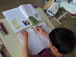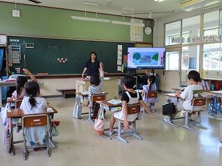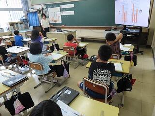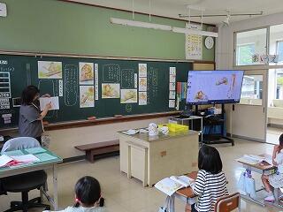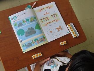 6月19日(水) 1年生の算数は今「たしざん」の学習をしています。「ひだりのはっぱにカエルが3びき」「みぎのはっぱにカエルが2ひき」「あわせてなんびきですか?」 1年生の子どもたちはブロックを操作しながら「5ひき!」と元気よく答えます。みんなで楽しく学習に参加しているのが印象的な今日の1年生の算数の授業風景でした。