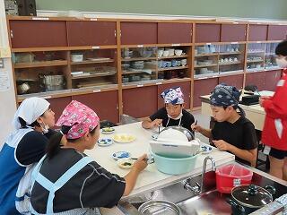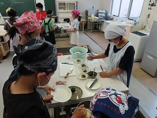 6月20日(木) ゆで野菜の調理。今日は5年生の調理実習の日です。「ゆで野菜」は、ほうれん草を使って調理実習を行う予定でしたが、野菜の値段が高騰しているため、今回は「小松菜」「ジャガイモ」を使っての実習となりました。野菜を洗って切って茹でて、ドレッシングも「和風」、「中華」、「オーロラ」と手作りです。やはり自分たちで協力して作った料理の味は格別だったようです。子どもたちからは笑顔がこぼれていました。