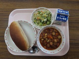 アメリカのテキサス州発祥のチリコンカンは、挽き肉、ソーセージ、玉ねぎ、白いんげん豆などたくさんの具材が入っています。サラダはキュウリやキャベツ、コーンにツナも加わっていて、どちらもとてもおいしいです。