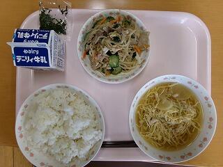 今日は奄美大島の郷土料理「鶏飯(けいはん)」でした。汁の中には、錦糸卵やしいたけ、たくわん、ねぎが入っており、ご飯にかけて食べると絶妙な味わいでした。とってもおいしかったです!スタミナサラダは何と、肉が入っていました!ボリューム満点でした!