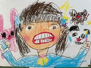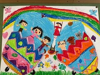 不思議な卵からとびでたものを大きなスケールで描けています。色使いも鮮やかです!