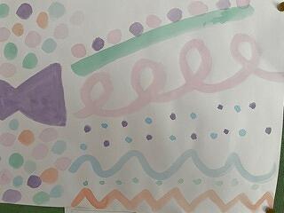 クラッカーから宝石がとび出た瞬間を表しました。くるくる、ギザギザ、点々、、、同じ間隔や大きさに描けています。