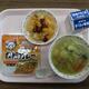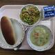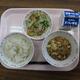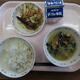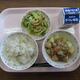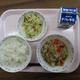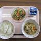 麦ごはん、白菜のみそ汁、肉野菜炒め   みそ汁は、白菜に加えて厚揚げ、大根、ワカメ、にんじんなどが入っています。肉野菜炒めは、豚肉、キャベツ、シメジ、ピーマンなどが入っています。どちらもとても味がよくて、野菜をたくさんいただくことができます。