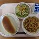 減量麦ごはん、豚骨ラーメン、中華サラダ   今日は豚骨ラーメンです。豚肉やコーン、チンゲン菜、ニンジンなどが入っています。6種類以上の野菜と10種類以上の調味料でつくられています。給食ならではの味付けでとても美味しいです。