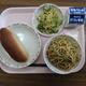 減量コッペパン、ミートソーススパゲッティ、白菜サラダ   スパゲッティは挽き肉、ニンジン、玉ねぎ、グリーンピースにソースがよく絡んでいます。サラダは白菜の甘さにコーンの甘さも加わっていて、野菜の味を楽しめます。今日もとても美味しい給食です。