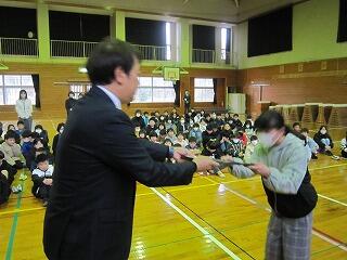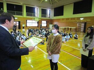校長、養教、生徒指導主事、それぞれの先生から、これまでの学校生活を振り返るとともに、冬休みを迎える心構えや大切なきまりなどについてのお話があり、最後に表彰を行いました。