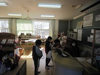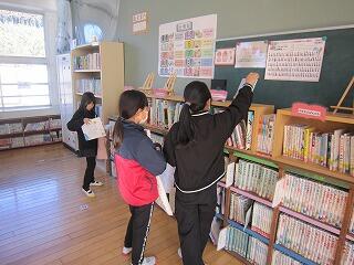 学校図書館では、冬休みの図書貸出が始まっています。今日は3年生が楽しそうに本を選んだり読んだりしています。