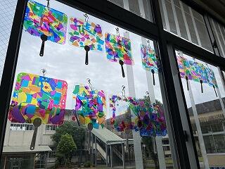 2年生の図工作品が、教室の窓に飾られています。