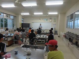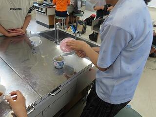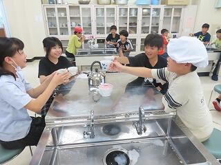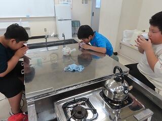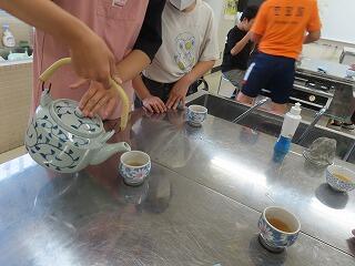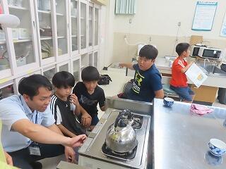 5年生が家庭科の学習で、自分たちで沸かしたお湯でお茶を淹れています。