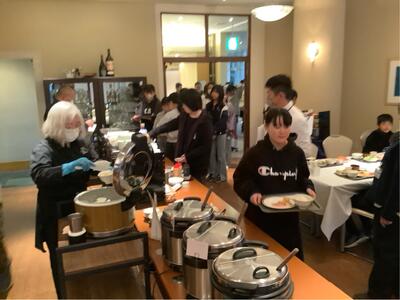 朝食は、ビュッフェ形式で、みんな手際よく食べものをとっていました。
