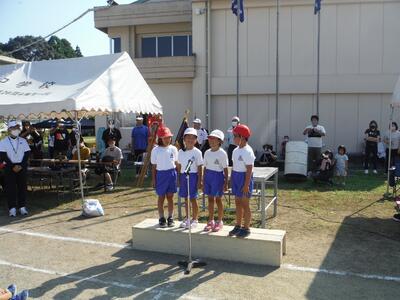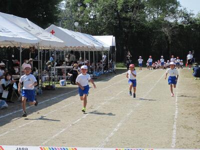 下学年徒走では、直線の走路をゴールめがけて走っています。