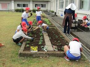 ・4年生です。丸い花壇に上手に植えます。 ・5年生です。一番広い花壇です。 ・6年生です。手際よく植えています。