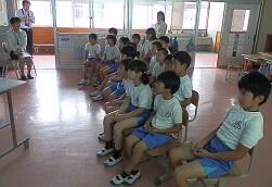 ・1、2年生、先生の注意を聞きます。 ・さあ、水につかりましょう!大丈夫かな?