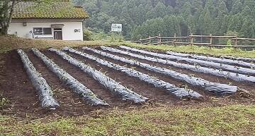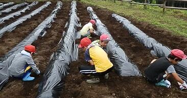 ・マルチのビニールを張ります。 ・ビニールの端に土をかぶせます。