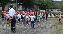 ・はじめに、防災のDVDを見ました。 ・今回は外階段を使う訓練でした。 ・静かに並びます。