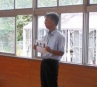 【対面式の様子】 ・校長先生のお話です。 ・ボランティアの方々です。 ・城攻め踊り保存会の会長さんとコーディネーターの方です。