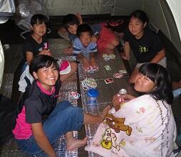 ・天気が良くなかったので、体育館にテントを張って寝ました(*^_^*) あれっ? 6年生でない子どもがいるぞぉ~!