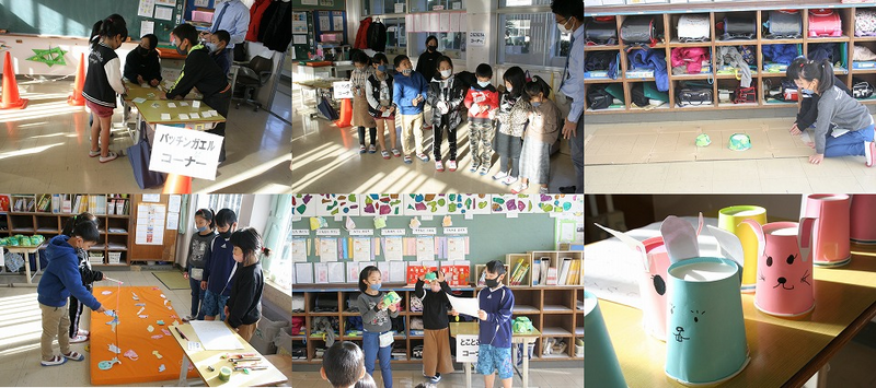 12月17日(木) 1・2年生が生活科の学習で「おもちゃまつり」を開催しました。2年生の子どもたちが1年生を招待して、様々なゲームに挑戦です。「ころころころん」「魚つり」「パッチンガエル」「とことこカメ」「ぴょんウサギ」「ロケットポン」。