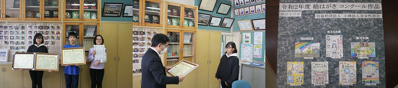 2月18日(木) 小林市法人会女性部会による「税に関する絵はがきコンクール」に6年生3名の児童が「最優秀賞」、「法人会長賞」、「奨励賞」を受賞しました。2月は全校朝会が実施できなかったため校長室にて、賞状と記念品の授与式を行いました。