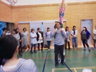 9月19日(金)合同運動会に向けて、城攻め踊りのリハーサルを中学校体育館で行いました。衣装を着るのにご協力をいただくため、まずは、保存会の方から保護者の方々に説明がありました。