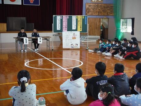 2月24日(水)児童総会を行いました。3年生から4年生が集まり、1年間の児童会の目標や委員会活動の報告・反省を行いました。今年の児童会目標は『あいさつができ、友だちを大切にする紙屋っ子』でした。