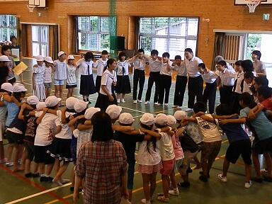 全校集会を開き、校長先生と生徒指導の先生から、夏休みの過ごし方などについてお話がありました。その後、保健室の先生から夏休みの宿題!が出されました。(え~っ!)