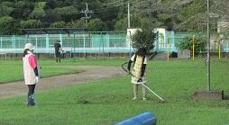 ・運動場のフェンスからはみ出している枝落としです。 樹木の剪定もしていただきました。