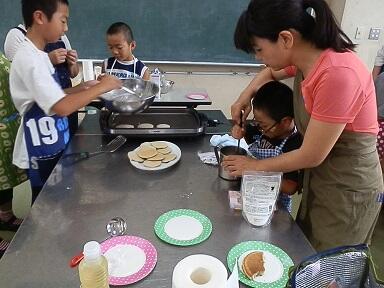 小中学校から11組計29名の親子が参加しました。九州パンケーキの粉に卵、牛乳を入れて混ぜ合わせ、ホットプレートで焼きました。焼き上がったパンケーキにバナナやブドウクリームなどをトッピングしてできあがりです。みんなで美味しくいただきました。