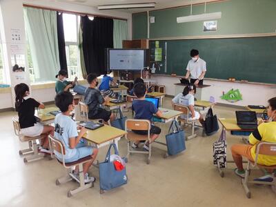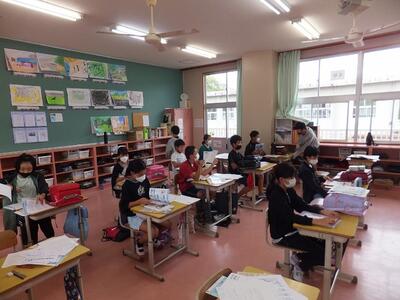 5年生は宿泊学習の振り返り→算数「割合とグラフ」を使ったグラフ提示→英語→合奏