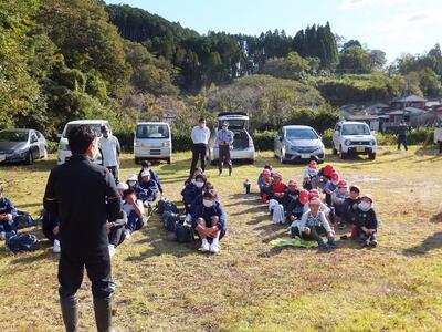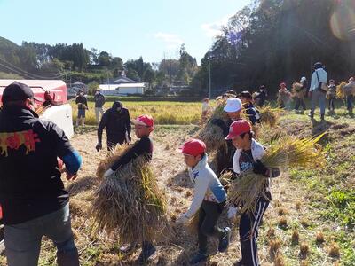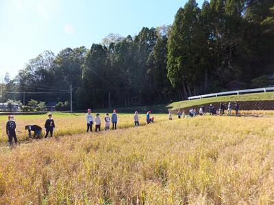 秋晴れの中、5年生及び中学生での合同稲刈りを実施しました。