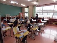 新しい担任の引率の下、進級した学年の教室で思い思いに過ごしました。