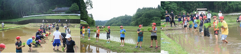 5年生と中学1・2年生は下の田んぼで田植えを行い、中学3年生