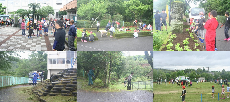 運動場の草刈り、一徳園内の草刈り、児童玄関前のソテツの剪定や