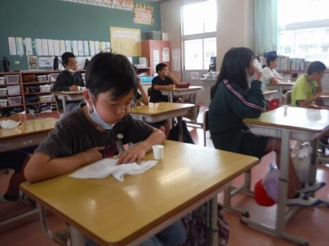 まずは、担任から一人ずつ紙コップにフッ化水を入れてもらい