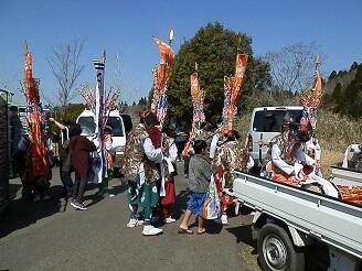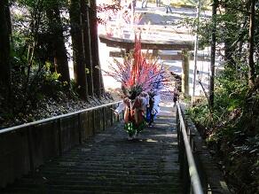 ・坂をおります。                 ・太鼓や鉦を打ち鳴らして、颯爽と歩きます。   ・神社の坂を登ります。約70段です。