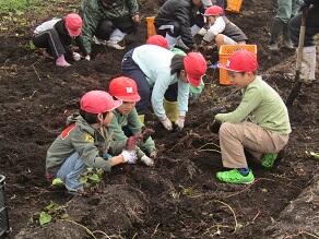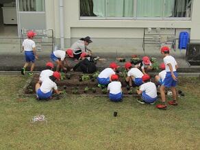 7名の5年生児童はみんなで仲良く一列にならんで、一本一本丁寧に苗を植えていくことができました。秋の収穫が楽しみです。この日はPTA生活指導部の方を中心にたくさんの保護者の方の応援もありました。ご協力ありがとうございました。