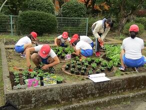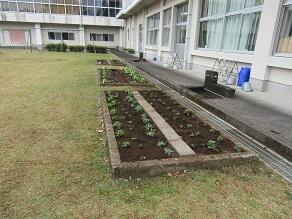 ・栽培活動の開始です!     ・植え終わりました。どの花壇もきれいに植えられています。花が咲くのが待ち遠しいですね(^o^)