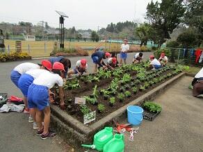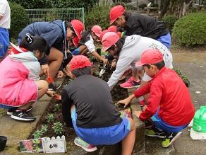 11月26日(月) この日は栽培活動がありました。各学級の花壇に花の苗を植える活動です。事前に子どもたちが花壇の整備をしましたが、学校用務員の先生がきれいに整地と肥料入れ等をしていただきました。もちろん、花の苗の準備もです。この日は子どもたちが考えた花のレイアウトにそって、苗を植えました。3校時の1時間(45分間)で終わりました。花壇にはきれいに植えられた花の苗が並んでいます。花が咲くのはまだ先ですが、日頃の手入れが大事になってきます。愛情を注ぎながら大切に育てましょう。みなさん、よろしくお願いしますよ(^^)