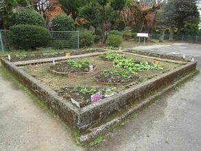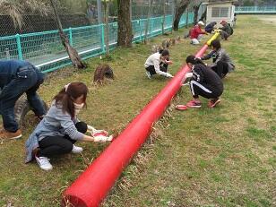 ・4年生です。丸い花壇に上手に植えます。  ・5年生です。一番広い花壇です。      ・6年生です。手際よく植えています。