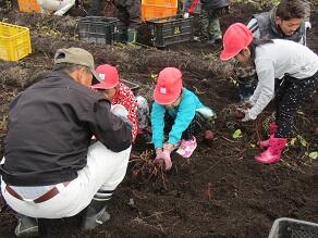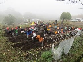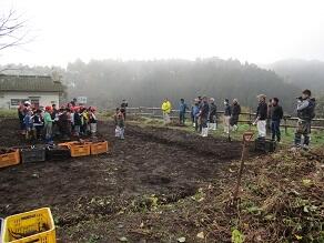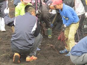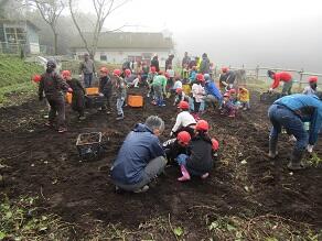 ・霧が立ちこめている中、始まりました。    ・手入れをしてくださった校長先生も一緒に掘ります! たくさん出てきました。