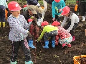 ・大きなイモがとれました!            ・よっこらしょ!どっこいしょ!            ・大人と一緒に、よっこらしょ!