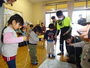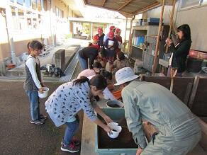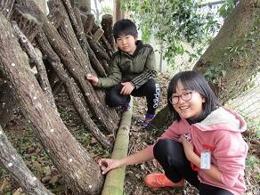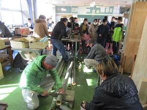 ・なかなか上手ですね!             ・立てる竹を切ります。中学生、ありがとう!   ・ 親子で協力して作ります。