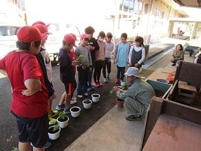 11月30日(金) この日も、26日(月)から始まった「一人一鉢」活動を行いました。卒業式の日に校内に飾る花の苗を植える活動です。清掃の時間を使って学年ごとに、学校用務員さんの指導の下、活動しました。学年によって育てる花が違います。はじめに作業の流れについて説明を受けた後、一人につき一つの鉢に苗を植えていきます。この苗は学校用務員の先生が種からていねいに育ててくださいました。ありがとうございました。最終日は12月3日(月)です。さあ、あとはみんなの育て方できれいに咲くかどうかが決まります。しっかりと責任をもって育ててくださいね。1年生は毎日、自分の鉢に、“おはよう、元気かな”とか、“きれいに咲いてね”などの声かけをしているそうですよ(^o^)名前をつけてあげるとより愛着がわいてくると思いますよ。“◯◯ちゃん、おはよう” “◇◇ちゃん、また明日ね”なんていいですよね。うんうん。